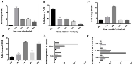 TLR3 and MDA5 play important immunity roles in DTMUV-infected DEF cells. DEF cells were infected with or without DTMUV and harvested at 12, 24, 36, 48, and 60 hpi. The qRT-PCR analysis was performed to examine the mRNA expression levels of RLRs (D), and Toll-like receptors (TLRs) (A–C). Comparison of TLRs and RLRs in DEF cells (E,F). The average levels from three independent experiments are plotted. The error bars represent the SEs. * P < 0.05, ** P < 0.01.