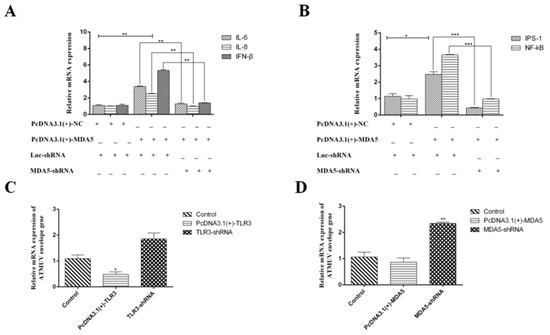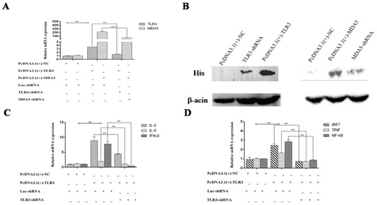 The above study showed that MDA5 and TLR3 are significantly increased in vivo and in vitro during DTMV infection. Therefore, we next investigated the functions of TLR3 and MDA5 in innate immunity. To explore the roles of TLR3 and MDA5, we over-expressed or silenced MDA5 or TLR3 in DEF cells. We then detected cytokine expression with qRT-PCR. To over-express TLR3 and MDA5, eukaryotic expression vectors containing TLR3 or MDA5 CDs were successfully constructed and named pcDNA3.1(+)-TLR3 and pcDNA3.1(+)-MDA5, respectively. Since we cannot find the duck antibodies of TLR3 and MDA5 either on the market or in our laboratory, we added His tags to the plasmids to detect the expression of TLR3 and MDA5 by anti-His antibody. To silence TLR3 and MDA5, specific shRNAs were designed and synthesized by GenePharma, which were named TLR3-shRNA and MDA5-shRNA. We generated pcDNA3.1(+)-NC and Luc-shRNA as negative controls. For over-expression of TLR3 and MDA5, we co-transfected pcDNA3.1(+)-TLR3/Luc-shRNA and pcDNA3.1(+)-MDA5/Luc-shRNA into DEF cells, respectively. pcDNA3.1(+)-TLR3/TLR3-shRNA and pcDNA3.1(+)-MDA5/MDA5-shRNA were transfected into DEF cells to inhibit TLR3 and MDA5 expression respectively. After 24 h, DTMUV was added to the cultures, and cells were harvested at 36 hpi. To confirm that MDA5 and TLR3 were successfully over-expressed or knocked down, we detected the mRNA and protein levels by qRT-PCR and Western blot analysis, respectively. As shown in Figure 9A,B, TLR3 and MDA5 were successfully over-expressed or knocked down at both the mRNA and protein levels. We next examined the mRNA levels of inflammatory cytokines, type I IFN and signal adaptors by qRT-PCR in the over-expressing and silenced lines. As shown in Figure 9C and Figure 10A, disruption of TLR3 or MDA5 expression resulted in low mRNA levels of IL-6, IL-8, and IFN-β. In contrast, over-expression of TLR3 and MDA5 increased the levels of these cytokines and type I IFN. Moreover, the expression of important adaptors of TLR3 (TRIF, IRF7, and NF-κB) and MDA5 (IPS-1, NF-κB) signaling pathways were also enhanced (Figure 9D and Figure 10B). However, disrupting TLR3 or MDA5 expression impaired the expression of these adaptors. Collectively, these results suggest that TLR3 and MDA5 are important innative factors to resist DTMUV, in which the TLR3 and MAD5 signaling can both target NF-κB to induce abundant inflammatory cytokines and type I IFN. Additionally, the TLR3 signaling pathway can target IRF7 to induce type I IFN.