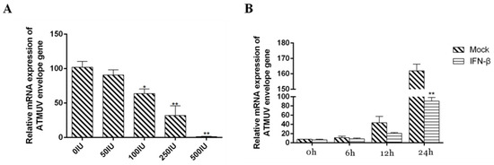 To investigate whether TLR3 and MDA5 can influence DTMUV replication, we over-expressed and silenced TLR3 or MDA5 in DEF cells. DTMUV envelop gene expression was then detected by qRT-PCR. As expected, TLR3 and MDA5 over-expression were found to impair DTMUV replication (Figure 10C,D). Many previous reports showed that type I IFN can inhibit the replication of viruses including dengue [39] and DTMUV [21]. We wondered whether type I IFN has antiviral activity in response to DTMUV infection in ducks. To address this, DEF cells were infected with DTMUV for 36 h and then treated with avian IFN-β at concentrations of 50, 100, 250, and 500 IU/mL. We found that avian IFN-β impaired DTMUV replication process in a dose-dependent manner (Figure 11A). Moreover, to determine whether the observed antiviral effects of avian IFN-β were time-dependent, we treated DEF cells with 500 IU/mL avian IFN-β for 0, 6, 12, or 24 h after infecting with DTMUV for 36 h. We found that the expression of E protein decreased with time (Figure 11B). These results suggest that MDA5 and TLR3 are important for inducing type I IFN and triggering effective antiviral immunity.