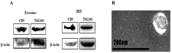 Morphological characterization and identification of exosomes. Exosomes were purified from serum-free medium of DEF cells, exosome protein markers (CD9 and TSG101) were identified by Western blot analysis. β-actin was used as an internal control. (A) their morphological features were observed by electron microscopy. Exosomes were nanometer-sized microvesicles (20–120 nm) (B).