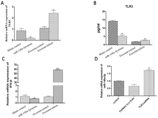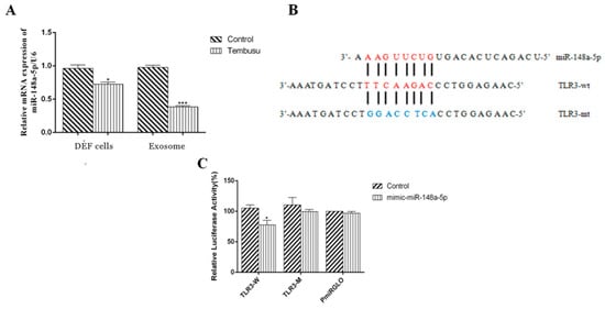 Previous reports have shown that miRNAs can regulate TLRs pathways in many diseases [40,41]. As such, we wondered whether miRNAs could regulate TLR3 or MDA5 expression in duck. In this study, we found that miR-148a-5p is a potential target miRNA of TLR3 by using miRanda and RNAhybrido. Unfortunately, we did not find miRNA that can potential target MDA5, thus in our study, we only explored the relationship between miR-148a-5p and TLR3. Firstly, we examined miR-148a-5p expression in DEF cells and DEF-derived exosomes with or without DTMUV infection by qRT-PCR. According to the results, we found that miR-148a-5p expression was reduced in both DEF cells and DEF-derived exosomes upon DTMUV infection compared with the non-infected controls (Figure 13A).