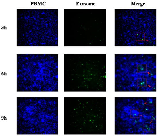 PBMCs ingest DEF-exosomes. To demonstrate that PBMCs could ingest exosomes secreted from DEF cells, we first stained exosome with PKH67 green fluorescent dye and co-cultured with PBMCs for 3, 6, and 9 h, and then the nucleus of PBMC were stained. Lately, we used fluorescence microscopy to detect the PBMC nucleus and exosomes respectively and then merged these pictures. From the merged pictures (200 μm), we can see that exosomes clustered around the nucleus of the PBMC, suggesting that exosomes were ingested by the PBMC.
