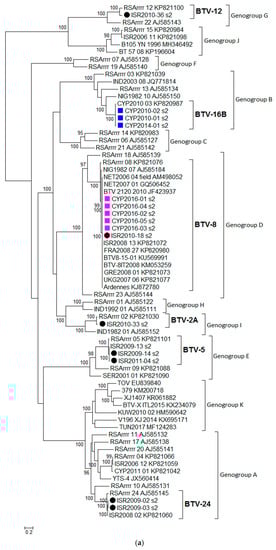BTV isolates sequenced in this study (n = 16) were assigned a genotype based on phylogenetic analysis of Segment 2 (Seg-2) (Table 1). Two genotypes such as BTV-8 and BTV-16B were detected in the isolates originating from Cyprus and five different genotypes (BTV-2A, BTV-5, BTV-8, BTV-12, and BTV-24) in the isolates from Israel. In addition, all sequences analysed were classified into eleven genogroups (designated from A to K) and this grouping was statistically supported (Figure 1a). Classical or notifiable BTV serotypes were assigned genogroups A to J, whereas atypical BTV genotypes (represented by the following strains TOV, 379, XJ 1407, V196 XJ 2014, BTV-X ITL2015, and KUW2010/02) were assigned to genogroup K.