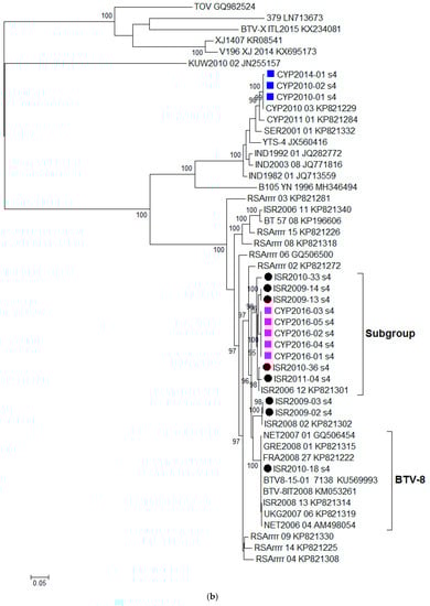 Isolates CYP2016/01-05 clustered together with several Israeli isolates sequenced in this study such as BTV-2A ISR2010/33, BTV-5 ISR2009/14, BTV-5 ISR2009/13, BTV-12 ISR2010/36, and BTV-5 ISR2011/04 and this grouping was statistically significant (supported by the ultrafast bootstrap value ≥ 95). The %nt identity between CYP2016/01 and other group members ranged from 97.57% (ISR2010-33) to 98.58% (ISR2006/12). In contrast, several BTV-8 isolates from the European countries (NET2007/01, NET2006/04, GRE2008/01, FRA2008/27, BTV8-15-01, BTV-8IT2008, and UKG2007/06) and Israel (ISR2010/18 and ISR2008/13) clearly form a separate subgroup (BTV-8) shown on the phylogenetic tree (Figure 1b). The %nt identity between CYP2016/01 isolate and this BTV-8 cluster ranged from 92.98% (BTV-8IT2008) to 95.31% (NET2007/01).