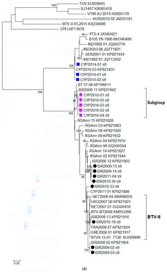 Based on the %nt identity, the closest relatives to CYP2016/01 were BTV-24 ISR2009-02 (99.82%) and BTV-24 ISR2009-03 (99.82%), followed by BTV-24 ISR2008-2 (99.74%), and all three sequences shared 100% similarity on the aa level and clustered together into a statistically supported subgroup (Figure 1d). BTV-8 sequences clustered together into a statistically significant subgroup (labelled as BTV-8 in Figure 1c), the %nt identity between CYP2016/01 and the BTV-8 sequences in this subgroup ranged from 98.12% (ISR2010-08) to 98.42% (UKG2007/06).
