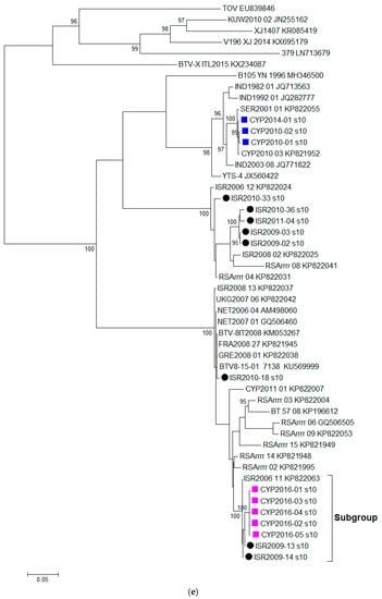 Based on the %nt identity, the closest relative to CYP2016/01 was identified as BTV-5 ISR2009/13 (98.88%) and both these sequences clustered closely with BTV-5 ISR2009/14 and BTV-15 ISR2006/11 (KP821098) (Figure 1e). The %nt identity between CYP2016/01 and other BTV-8 sequences ranged from 92.50% (BTV-8IT2008) to 95.27% (NET2006/04, NET2007/01, and ISR2010/18).