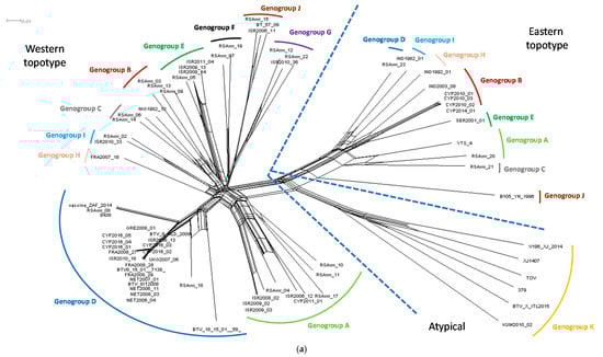 (a) The Neighbor-Net network was estimated from an alignment of 18,621 characters for each of 73 taxa, which sequence composed of the concatenated coding regions of BTV (VP1–VP7 and NS1–NS3); and (b) genogroup D of the Neighbor-Net network. Nomenclature used in-line with that proposed by the BTV-GLUE resource for the BTV Segment 2. Solid coloured lines were added manually to indicate the genogroup while the dashed blue lines were added manually to indicate the distinct differences between the western and eastern topotypes, and genogroup K which contains the atypical BTV strains.