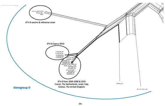 The split network was estimated from an alignment of 18,621 characters for each of 73 taxa, which sequence composed of the concatenated coding regions of BTV (VP1–VP7 and NS1–NS3). The Neighbor-Net network shows the split between the BTV strains belonging to the western and eastern topotype in addition to the formation of separate genogroup K containing the atypical BTV strains (Figure 2). The CYP2016/01-05 sequences clustered together with other western topotype strains belonging to genogroup D, but clearly split from the European BTV-8 strains from the 2006–2008 and 2015 outbreaks as well as the BTV-8 vaccine and reference strains (Figure 2b).