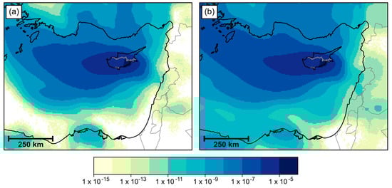 Maps of the near-surface history of air passing over the Larnaca region, aggregated over the period 21 July to 18 September 2016. Air parcels with a lifetime of (a) 24 h and (b) 36 h are shown.