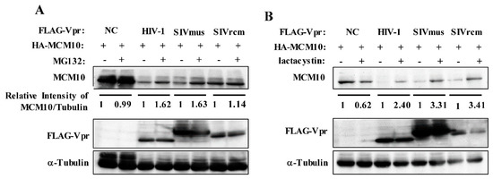 MCM10 degradation by HIV-1, SIVmus, and SIVrcm Vprs via proteasome dependent pathway. HEK293T cells were transiently transfected with pcDNA 3.1/HA-MCM10 together with either pcDNA3.1/3 × FLAG-HIV-1, SIVmus, and SIVrcm Vprs, or the control pcDNA3.1/3 × FLAG (NC: negative control). After 43 h of transfection, cells were treated with 10 μM MG132 (a reversible proteasome inhibitor) or DMSO (A), and another irreversible proteasome inhibitor, lactacystin (20 μM) or DMSO (B). Cells were harvested at 48 h after transfection and lysates with equal protein amounts were subjected to western blotting with anti-FLAG mouse mAb, anti-HA mouse mAb, anti-α-Tubulin mouse mAb (upper panel). The positions of 3 × FLAG-Vpr, HA-MCM10 and α-Tubulin are shown. Band densities of HA-MCM10 and α-Tubulin were quantified by densitometry analysis using ImageJ software. The relative intensities were calculated as the ratio of density of MCM10 to density of α-Tubulin.