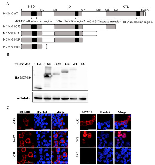 Expression and localization of MCM10 mutants. (A) Schematic diagram shows the domain structures of wildtype and MCM10 truncation mutants. Positions of the predicted N-terminal domain (NTD, 1-165), internal domain (ID, 230-427), C-terminal domain (CTD, 596-860), recently identified MCM2-7 interaction region (530-655). MCM10 self-interaction region involved in NTD and 2 DNA interaction regions located in ID and CTD are indicated. (B) Expression of MCM 10 mutants. HEK293T cells were transiently transfected with pcDNA3.1/HA-MCM10 WT, 1-165, 1-427, 1-530, or 1-655, respectively. Transfected cells were harvested at 48 h of post-transfection and lysates with the equal protein amounts were subjected to western blotting. The positions of HA-MCM10 and α-Tubulin are indicated. (C) Subcellular distribution of MCM 10 mutants. HEK293 cells were transiently transfected with either pcDNA3.1/MCM10 HA-WT, HA-1-165, HA-1-427, HA-1-530, or HA-1-655 and the subcellular distribution of MCM 10 mutants was determined via immunofluorescence staining with anti-HA mouse mAb at 48 h post-transfection. The nucleus was stained with Hoechst 33342 and observed using an FV-1000 fluorescence microscope. Bar = 20 µm.