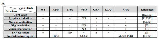 Viral protein Rs (Vprs) are multifunctional accessory proteins, found among all primate lentiviruses, including HIV-1 and HIV-2 and various SIVs. A striking feature of Vpr is its unique potential to promote viral productivity in monocytes/macrophages and in a small population of CD4+ T cells [2]. Once encapsulated and released into the cytoplasm, Vpr initiates multiple functions which are consistent with well-organized viral replication circles. Vpr promotes accurate viral genomic RNA reverse transcription [3,4], pre-integration complex (PIC) formation and nuclear localization [5,6,7], transcription regulation of viral and host genes [8], disorders of spliceosome complex processing [9,10], dysregulation of the cell cycle and positive and negative regulation of apoptosis [11,12,13], as well as the activation of DNA damage response pathways [14,15]. Notably, Vpr hijacks the DCAF1 (DDB1)-Cul4-E3 ubiquitin ligase complex resulting in the ubiquitination of numerous cellular targets and ensuing proteasome-dependent degradation [16]. Previous works showed that HIV-1 Vpr interacts with DCAF1 (DDB1)-Cul4-E3 ubiquitin ligase complex to modulate multiple cellular targets’ function and led to proteasome-dependent degradation. Furthermore, such modulation is essential for viral replication and in favor of virus escaping from immune surveillance of hosts [17].