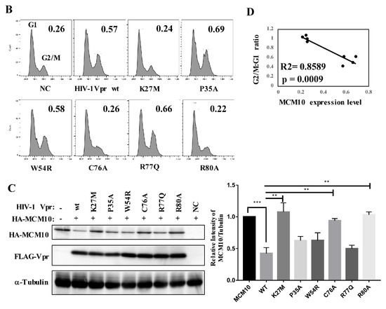 Finally, quantitative data related to MCM10 degradation profiles and G2/M:G1 ratios, associated with Vpr mutants, indicated a high correlation (R2 = 0.8589; p = 0.0009) with each of the functions tested (Figure 8D). The G2/M arrest function of HIV-1 Vpr was specifically correlated with MCM10 degradation. By contrast, R77Q, an apoptosis induction-deficient mutant, downregulated MCM10 expression, demonstrating that MCM10 expression levels were not affected by the apoptosis function of HIV-1 Vpr. Another mutant P35A, which lost the Vpr oligomerization function, also failed to reverse MCM10 degradation.