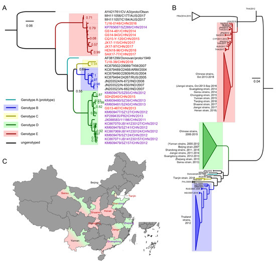 All VP1 sequences (n = 34, 11 from this study, 23 from GenBank) were collected and used for CV-A8 genotyping (Table 1). Almost all the partial VP1 sequences (n = 160 from GenBank, 155 bp, dated to 1 June 2020) were retrieved and trimmed for phylogenetic analysis. Notably, among a total of 13 Chinese entirely VP1 sequences from GenBank, eleven (85%) were from Guangdong Province, whereas the 11 sequences contributed by this study were from seven different provinces and municipalities; hence, this study improved the geographical representation of Chinese CV-A8 sequences used for genetic analyses (Figure 1C).