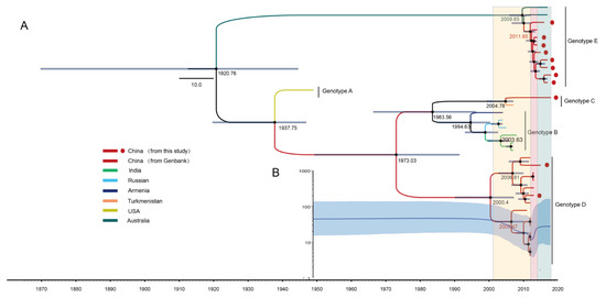 The MCC trees based on the 34 CV-A8 complete VP1 sequences were generated using the MCMC method (Figure 2A). The computed MCC tree revealed that genotype E has been evolving for nearly a century and then somehow emerged in approximately 2010. The evolutionary substitution rate for the VP1 region of CV-A8 was 4.48 × 10−3 (95% highest posterior density (HPD) (2.80–6.14)) × 10−3 substitutions site−1 year−1, with a predicted date of tMRCA at 1921 (95% HPD 1870–1945). Genotype A was suggested to have diverged in approximately 1938, and the tMRCAs of genotypes B, C and D could be traced back to 1995, 2005 and 2000, respectively.