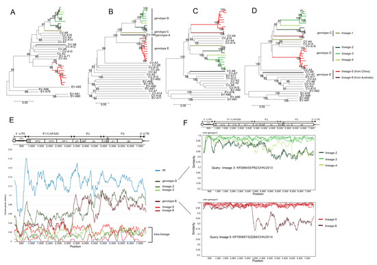 NJ trees were constructed based on the 5′UTR, P1 capsid, P2 and P3 non-capsid region of the 23 CV-A8 variants combined with the other EV-A prototype strains (Figure 3A–D). Obvious discrepancies were reflected, suggestive of polyphyletic recombination among CV-A8 variants. However, the recombination within each genotype was not monophyletic either. Taking the non-capsid P3 phylogeny as an example, within genotype D, the tree indicated three independent lineages (Figure 3D), implying that three diverse recombination events occurred among genotype D strains; genotype E even reflected more apparent phylogenetic violation in that the Chinese strains and the Australian strains were separated into two lineages by other EV-A prototype strains, which suggested distinct evolutionary routes. The strains that formed each recombinant lineage in the P3 region also clustered the most closely together in the 5′UTR and P2 region, which indicated intra-lineage whole-genomic monophyly. Therefore, genotypes D and E contained three and two recombinant lineages, respectively, which were designated as recombinant lineages 2–6. The Tianjin strain from genotype C was named lineage 1 (Figure 3A–D).