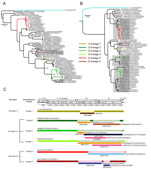 3.6. Multiple Recombination Events Were Detected among CV-A8 Variants