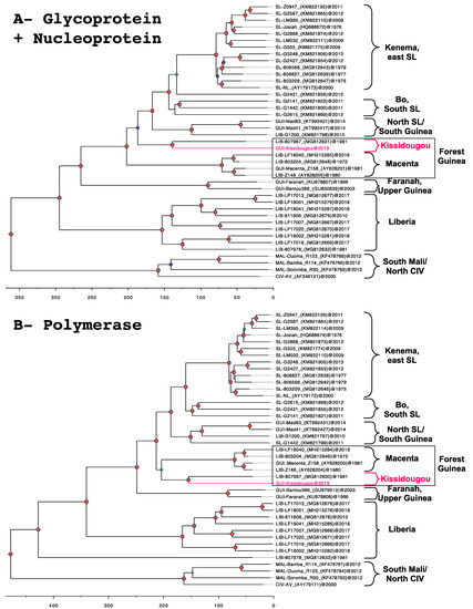 - Olayemi, A.; Adesina, A.S.; Strecker, T.; Magassouba, N.; Fichet-Calvet, E. Determining Ancestry between Rodent- and Human-Derived Virus Sequences in Endemic Foci: Towards a More Integral Molecular Epidemiology of Lassa Fever within West Africa. Biology 2020, 9, 26. [Google Scholar] [CrossRef] [PubMed]