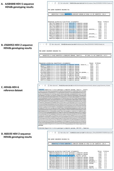 We investigated results for the other genotypes with complete sequences (21 HDV-1, 7 HDV-2, 9 HDV-3, 7 HDV-4, 17 additional HDV-5, 12 HDV-6, 9 HDV-7, 8 HDV-8) accurately characterized by the French National Reference Center for HDV (FNRC, Bobigny, France) [4]. All tested sequences (n = 95) are available upon request. Further discordances were noted for HDV genotype 2 (HDV-2). Indeed, one HDV-2 sequence, namely LT604953, corresponding to the first HDV-2 described in Yakutia in 2001 (Strain “Yakut-6”) [5], was genotyped HDV-6 by the HDVdb genotyping tool (Figure 1B) and was also found in the overall complete genome dataset and the specific “HDV_genome_6” dataset provided online by HDVdb (Figure 1C, http://hdvdb.bio.wzw.tum.de/hdvdb/Downloads/Dataset/hdvdb_dataset_page/Genome_6.fasta). Here, again, a mistake concerning LT604953 affiliation was evidenced, which may lead to a wrong genotyping result for the query sequence. Additionally, three other HDV-2 sequences—namely X60193 (HDV-2 reference according to ICTV, as this strain “HDVJS” corresponds to the first HDV-2 strain described [6]), LT594481|strain dFr5820, and MA997213—were genotyped as HDV-1 by the HDVdb genotyping tool. LT594481|dFr5820 is also included in the “HDV_genome_1” reference dataset and may lead to further mis-genotyping of closely related sequences. In contrast, despite a wrong genotyping result as HDV-1 instead of HDV-2 for the X60193 sequence by the analysis tool (Figure 1D), the same accession number X60193 was correctly attributed to the “HDV_Genome_2” in the HDVdb reference dataset. Of note, the mis-attribution of genotypes in reference datasets may be due to the JAVA programming language pipeline created by Usman et al., to automatically extract for each accession number, the strain name, the genotype, the country of origin, and the date [1]. Of note, all other tested sequences were correctly genotyped.