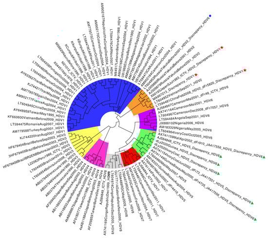 Phylogenetic tree computed with MEGA7 and represented upon a cladogram type using Figtree v1.4.4. The percentage of replicate trees in which the associated taxa clustered together in the bootstrap test (1000 replicates) are shown next to the main genotype branches. The analysis involved 84 complete genome sequences. All positions containing gaps and missing data were eliminated. There were a total of 1247 positions in the final dataset. HDV-1 is represented in blue, HDV-2 in orange, HDV-3 in yellow, HDV-4 in pink, HDV-5 in green, HDV-6 in purple, HDV-7 in red, HDV-8 in grey. Green triangles highlight HDV-5 sequences genotyped as HDV-6 by HDVdb genotyping tool. Red stars highlight HDV-2 sequences genotyped as HDV-1. Blue circle highlights HDV-2 sequence genotyped as HDV-6.