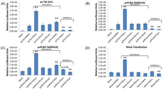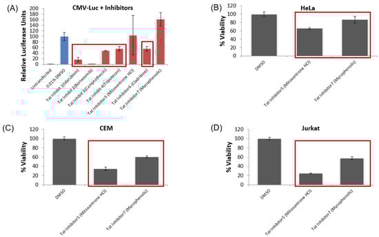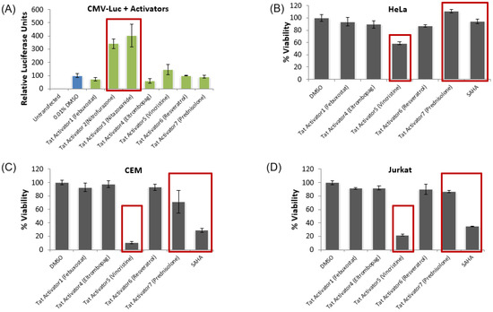 Sampey, G.C.; Iordanskiy, S.; Pleet, M.L.; DeMarino, C.; Romerio, F.; Mahieux, R.; Kashanchi, F. Identification of Modulators of HIV-1 Proviral Transcription from a Library of FDA-Approved Pharmaceuticals. Viruses 2020, 12, 1067. https://doi.org/10.3390/v12101067