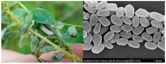 Host larva displaying symptoms of MaphGV infection and the corresponding occlusion bodies. (A) Matsumuraeses phaseoli larva in the glued Astragalus membranaceus leaves exhibiting symptoms for baculovirus infection. (B) MaphGV occlusion bodies as seen under scanning electron micrograph. The scale of measurement is marked in the bottom right corner.