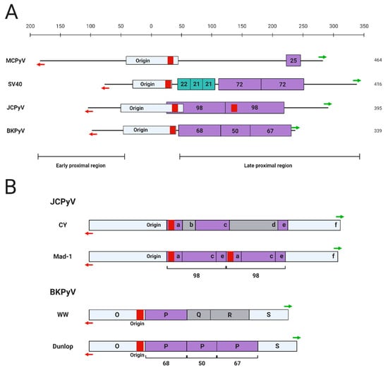 For polyomaviruses, the transcriptional control exerted by cis-acting regulatory elements such as promoters, enhancers, and silencers is an important factor contributing to the virus’ ability to complete its life cycle in the host cell [12,13,14,15]. This is especially true for MCPyV and JCPyV, each of which maintain a highly restrictive in vitro host range limited to human and chimpanzee dermal fibroblasts and human glial cells, respectively [11,13]. The NCRR region of the primate polyomaviruses contains a core origin region that includes a poly A/T tract essential for the initial unwinding of the viral DNA during replication [16,17] (Figure 2). Overall, however, the sequence and structure of the NCRR are highly varied among the different polyomaviruses (Figure 2A). Specific strains of each polyomavirus also contain rearrangements of the NCRR structure, leading to the categorization of certain polyomavirus strains as “archetypal” or “prototypical” based on the presence of certain cis-acting elements in the NCRR (Figure 2B).