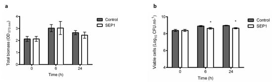 Characterization of the effect of Sepunavirus phiIBB-SEP1 (SEP1) on 24 h S. epidermidis 9142 biofilms, using a MOI 1. (a) Effect on the total biomass of biofilms was assessed by crystal violet. staining measured at an optical density OD570; (b) effect on the total number of viable cells was assessed by colony-forming unit (CFU) counting. The values represent the mean plus and minus standard deviation of two independent experiments performed in triplicate. Statistical differences (p < 0.001) between control and SEP1-treated cells (*) were determined by two-way repeated-measures analysis of variance (ANOVA) with Bonferroni post hoc test.