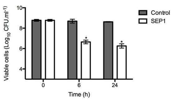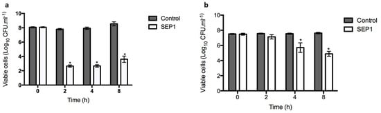 Persister cells are a subset of the biofilm population, which are tolerant to antibiotic killing, being responsible for the recalcitrance of infections []. S. epidermidis persister cells were obtained after contact with vancomycin for 48 h. The effect of SEP1 against persister cells is visible in Figure 2b. In general, SEP1 demonstrated a poor reduction ability against persister cells in the first 2 h, achieving a better reduction of 2 orders-of-magnitude at 4 h. After 8 h, SEP1 reduced by approximately 3 orders-of-magnitude the number of S. epidermidis culturable cells.
