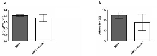 The biofilm matrix was extracted from biofilm cells and put in contact with SEP1 for 2 h at 37 °C. The results demonstrated that the biofilm matrix did not impair phage’s infectivity, as no significant differences (p > 0.05) were detected in the phage titer between matrix containing experiments and the negative control (Figure 4a).