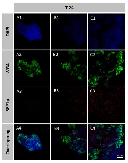A probe was developed to detect the location of the biofilm cells that are infected by phage SEP1. Biofilms were formed directly on Thermanox™ coverslips and infected with SEP1 for 24 h. Biofilms were further fixed, stained, and observed by CLSM. CLSM in conjugation with the probe and two different dyes was used to differentiate bacterial cells from phage-infected cells and major matrix component PNAG (Figure 5).