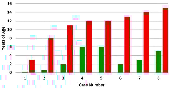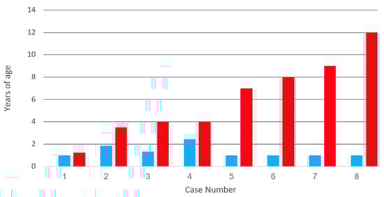 Duration between varicella vaccination and varicella vaccine meningitis in eight children. All children had received one varicella vaccination, after which they later developed herpes zoster and meningitis. Data from references [,,]. Note the absence of pattern to the time intervals between vaccination and meningitis. Age of varicella vaccination: blue bar; age of meningitis: red bar.