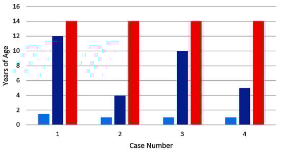 Duration between varicella vaccination and varicella vaccine meningitis in four children. All children had received two varicella vaccinations. All four children developed herpes zoster and meningitis 13 years after their first vaccination. Data from references [,,]. Age of first varicella vaccination: light blue bar; age of second vaccination: dark blue bar; age of meningitis: red bar.