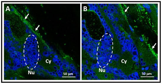 Varicella antibody in the cerebrospinal fluid. Varicella antibody was detected by a fluorescent antibody to membrane antigen test. The test was carried out by confocal microscopy imaging of varicella-zoster virus (VZV) infected monolayers. Two confocal images are shown (A and B). Clusters of nuclei (Nu; blue circles) within the cytoplasm (Cy) of an infected cell are encircled by a dashed white line. Arrows point to positive fluorescent antibody attaching to VZV antigens in the plasma membrane. The majority of the positivity resides in the plasma membranes of the infected cells because that is where the majority of viral glycoproteins are located. One viral target is VZV glycoprotein gE.
