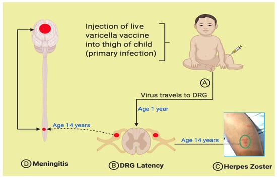 To date, the cases described in Table 1 and Table 2 gave a history of herpes zoster proceeding or concomitant with onset of symptoms of acute meningitis. After review of prior models [], we propose a pathogenesis model (Figure 4). Every child around the age of 1 year is given an initial injection of the live attenuated varicella vaccine in the thigh (Figure 4A). Virus replicates locally in the skin; some viral particles enter the free endings of A and C nociceptor fibers, after which the viral particles are transported to the soma of lumbar DRG, where the virus enters a latent state (Figure 4B). (A second vaccine injection can be given before the child enters primary school). Several years later, the vaccine virus reactivates from the DRG, after which the virus is carried in the same pseudounipolar fibers anterograde to the thigh (distal process), presenting as herpes zoster in a lumbar dermatome on the leg (Figure 4C; vesicles are encircled). In turn, the virus can also travel proximally from the DRG to the gray matter of the spinal cord, where replication occurs (Figure 4D). From the lumbar spinal cord, the virus can be transported to the brain via interneurons within the spinothalamic tract.