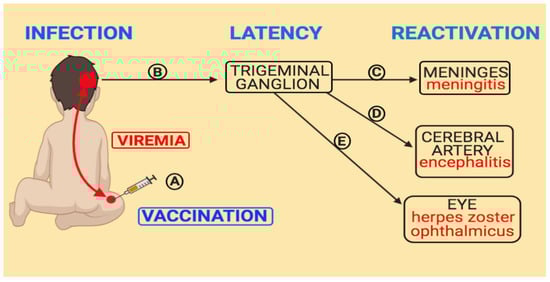 Varicella vaccine meningitis after herpes zoster ophthalmicus (HZO) deserves a special mention. The trigeminal ganglion can be considered the DRG equivalent for sensory relays to the head and face. As with the DRG, pseudounipolar sensory neurons transmit stimuli from nociceptors in the face and head, including the meninges, to the soma in the trigeminal ganglion []. Meningitis after HZO occurred in one case cited in Table 1 []. Another case of severe HZO caused by the varicella vaccine virus has been published, but a lumbar puncture was never performed []. Since the first varicella vaccination is administered in the thigh, the details within Figure 4 do not apply to VZV latency within the trigeminal ganglion and subsequent HZO. Instead, we have prepared another pathogenesis figure (Figure 5). Around 50% of children have a viremia after their first varicella vaccination []. The vaccine virus is carried in the blood stream throughout the body and can infect DRG far beyond the lumbar area and establish distant sites of latency; by this means, the virus passes through the arterial blood supply to the trigeminal ganglion, especially the ophthalmic branch []. When the virus reactivates within the ophthalmic branch of the trigeminal ganglion (HZO), the virus can be transported anterogradely along afferent fibers to the meninges (dura mater, arachnoid mater and pia mater), the cerebral arteries or the eye [].