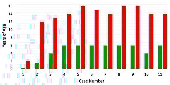 A recent review of aseptic meningitis in children in Ireland reported 11 cases of VZV meningitis or meningoencephalitis in immune competent children with a prior history of childhood varicella but no herpes zoster []; in other words, these 11 children presumably had VZV reactivation in the CNS without clinical herpes zoster (Figure 7). Of interest, 10 of the 11 children were adolescents between ages 12–16. One child was just 2 years old, but that child had a primary varicella infection under age 1. This subgroup from Figure 6 and Figure 7 is known to have earlier VZV reactivation, probably because a suboptimal and short-lived VZV-specific immune response occurs in babies exposed to varicella in utero or in the first months of life [,].