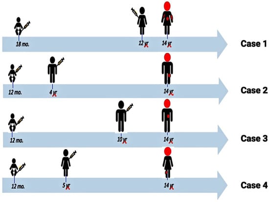 Similarities among the four twice-immunized adolescents who developed varicella vaccine meningitis. All four were given their first varicella vaccination between 12–18 months of age. All four manifested herpes zoster with meningitis at the age of 14 years (heads colored red). Thus, there was a pattern between time of first varicella vaccination and onset of meningitis (~13 years). Data from reference [].