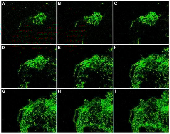 Vesicle of wild type herpes zoster. The VZV glycoprotein gC is a component in the envelope of a VZ virion; every vesicle is filled with virions. The protein is immunolabeled green by a monoclonal antibody probe. The nine micrographs show images of the abundant VZV gC protein from serial sections cut through a herpes zoster vesicle from an edge to the center (A–I). Magnification = 200×.