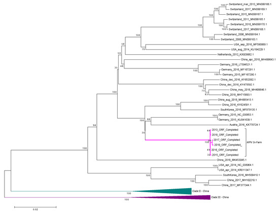 A phylogenetic analysis of the full-length APPV sequences available worldwide and obtained from the NCBI database and six APPV sequences obtained in the present study (Section 3.5) confirmed the division of APPV into three different clades, two of them containing only sequences from China (Figure 2). APPV sequences from the current study clustered in one subtree together with two German sequences (NC_030653 and KU041639, from 2015), one Austrian sequence (KX778724, from 2016), two Chinese sequences (MH885413, from 2018, and KY624591, from 2016) and one South Korean sequence (MF979135, from 2016). The other full-APPV genome from The Netherlands available in NCBI was clustered within the same clade, but into a different subtree, together with eight sequences from Switzerland and two from the US (Figure 2).