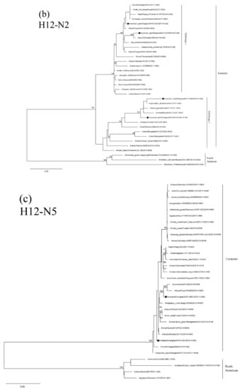 Results of phylogenetic analysis showed that the NA genes of these H12 isolates are clustered in the Eurasian lineage. Isolates NH101807-H12N2 and NH112319-H12N2 are clustered with the AIVs found in Japan and Korea in a small sublineage. The other two H12N2 isolates and the H5 N2 isolates found in Korea form a sister sublineage (Figure 4b). The N5 and N8 genes of these H12 isolates are in the same group as those of the H6N5, H12N5 and H3N8 AIVs circulating in Mongolia, China and Japan, respectively (Figure 4c,d).