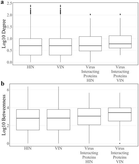 After construction (see Section 2), the Host Interaction Network (HIN) contains 6,281 proteins and 31,079 interactions. Median log10 degree and betweenness of the HIN is 0.699 and 2.945, respectively. In the construction of the Virus Integrated Network (VIN), 23 of the 27 SARS-CoV-2 proteins tested in Gordon et al. [7] are added to the network along with 152 interactions with 148 existing host proteins. Four SARS-CoV-2 proteins, spike, nsp11, ORF3b, and ORF7a, had no known interactions with host proteins of the HIN and were omitted from the analysis. In total, the VIN contains 6304 proteins and 31,231 interactions. Median log10 degree and betweenness of the VIN is 0.699 and 2.823, respectively. There is no statistical difference between the degree or betweenness of the HIN and VIN (Wilcoxon rank sum test p-values: 0.776 and 0.994, respectively). However, all host proteins have higher betweenness in the VIN compared to the HIN. While viral proteins only interact with 148 proteins, the topological effects are seen across the entire network.