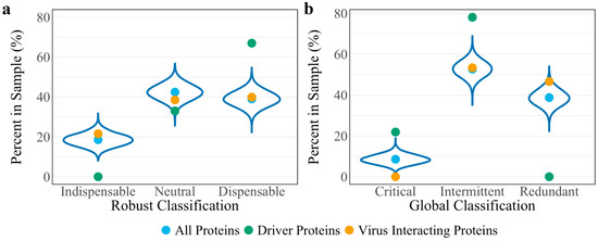 Similarly, a global controllability analysis was performed on the HIN and VIN as described in Section 2. Results are shown in Table 4. As in the robust controllability analysis, global controllability classifications of the VIN’s proteins are almost identical to those of the HIN. Over half (VIN: 52.7%, HIN: 52.8%) of all proteins are classified as intermittent, suggesting that the majority of proteins are able to play a role in cellular regulation. Only a small percentage (VIN: 8.6%, HIN: 8.4%) of all proteins are classified as critical, meaning they are involved in all combinations of network regulators. By definition, driver nodes cannot be redundant, therefore, they are predominately classified as intermittent (VIN: 78.1%, HIN: 80.5%). Unlike the robust analysis, classifications of virus interacting proteins differ slightly from those of the total protein population. The eight critical virus interacting proteins of the HIN become intermittent in the VIN, losing some control over infected network regulation. There is a higher proportion of redundant virus interacting proteins in the VIN (46.6%) compared to both the virus interacting proteins in the HIN and all proteins of both the VIN and HIN (HIN virus interacting proteins: 32.9%, VIN all proteins: 38.7%, HIN all proteins: 38.8%), suggesting that proteins that directly interact with the virus are transitioning into deferential roles after the onset of infection. All 23 viral proteins are classified as critical in the VIN, always holding control of network regulation.