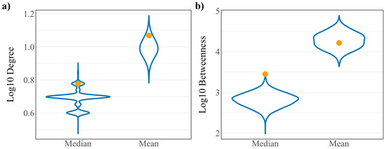 To assess whether the robust controllability classifications of the driver and virus interacting proteins are a result of the network’s connectivity structure, a randomization analysis was performed as developed in previous work [11]. A random set of 148 host proteins representing a “pseudo-virus interacting” protein set was pulled from the network and assessed for robust controllability. The resulting distributions from 10,000 iterations of this process are reported in Figure 2a against the true values for all proteins, driver proteins, and virus interacting proteins. Distributions are reflective of the true values of all proteins for all three robust controllability classifications. True values for virus interacting proteins also fall within the distributions for robust classifications implying that there is no regulatory advantage for the particular set of host proteins interacting with SARS-CoV-2 within the robust controllability framework. However, true values for driver proteins fall outside the distributions generated by the pseudo-sets, implying that the groups are distinctly different in regulatory function. A topological analysis including the median and mean values of the same distributions against the true values for virus interacting proteins is shown in Figure 3. The mean log10 degree and betweenness is significantly higher than the corresponding distribution mean (one-sided t-test p-values: 2.2 × 10−16, 2.2 × 10−16) implying that the virus prefers to interact with proteins that hold significance to network structure.