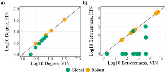 The betweenness of the global protein set increases after the addition of virus–host interactions. In particular, the betweenness of eight of the global proteins (SCARB1, PVR, EIF4E2, CEP135, SIGMAR1, TOR1AIP1, RAB14, and SAAL1) is 0 in the HIN before increasing by several orders of magnitude in the VIN, implying that these proteins are integrated into the network information flow at the onset of infection. Supporting this, seven of the eight shift from critical to intermittent classification (SIGMAR1 becomes redundant) after the integration of viral interactions, indicating new regulation and a loss of control over the network. A topological comparison of the robust and global protein sets within the HIN and VIN (Figure 4) demonstrates larger differences between the degree and betweenness of the two networks, making the global controllability analysis a better predictor of the regulators of the infected cell.
