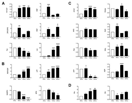 Metabolomic analysis of glycolysis/tricarboxylic acid (TCA)/pentose phosphate pathway (PPP). Small alveolar epithelial (SAE) cells were infected with respiratory syncytial virus (RSV) for 0, 6, 15, and 24 h at an MOI of 3. Cells were then harvested to measure metabolites found in the (A) glycolytic pathway, (B) pentose phosphate pathway, (C) TCA pathway, and the (D) glutamine pathway by GCMS/LCMS. F6P/G6P: fructose 6-phosphate/Glucose 6-phosphate; FBP: fructose 1,6, biphosphate; 2PG/3PG: 2-phosphoglycerate/3-phosphoglycerate; PEP: phosphoenolpyruvate; Pyr: pyruvate; Lac: lactate; R5P/X5P: ribulose-5-phosphate/xylulose-5-phosphate; s7P: sedoheptulose-7P; NADPH: nicotinamide adenine dinucleotide phosphate reduced; 6PG: 6-phospohogluconic acid; aCoA: acetyl-CoA; AKG: alpha-ketoglutarate; SUC: succinate; Asp: aspartate; MAL: malate; ATP: adenosine triphosphate; ADP: adenosine diphosphate; Glu: glutamate; Gln: glutamine. Data are presented as mean ± SEM. Significant results as compared to the uninfected control are marked with asterisks (* for p ≤ 0.05, ** p ≤ 0.01, *** p ≤ 0.001, **** p ≤ 0.0001).