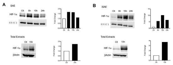 HIF-1α activation in response to RSV infection. Cells were infected with RSV and harvested at the indicated time points. Nuclear and total lysates of (A) SAE and (B) immortalized SAE (iSAE) cells were then subjected to Western blot analysis to determine HIF-1α levels. Western blot analyses shown here represent one independent experiment. All experiments were repeated at least twice. Densitometric analysis of band intensity, normalized to HDAC-1 for nuclear extracts and βActin for total lysates, is shown to the right of each blot.