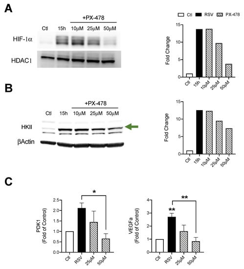 Effect of HIF-1α inhibition on metabolic enzyme expression. Cells were treated with PX-478 (10, 25, or 50 μM) for 1 h, followed by infection with RSV. Cells were harvested at 15 h p.i. to prepare nuclear extracts or total cells lysates. Expression of (A) HIF-1α and (B) HKII was determined by Western blot analysis. Densitometric analysis of band intensity, normalized to HDAC-1 for nuclear extracts and βActin for total lysates, is shown to the right. (C) RT-PCR was performed to measure gene expression of PDK1 and VEGFα. Data are presented as mean ± SEM. Western blot analyses shown here represent one independent experiment. All Western blot experiments were repeated at least twice. PCR analyses represent combined data from three independent experiments. Significant results as compared to the respective control are marked with asterisks, and additional comparisons between groups are indicated with brackets (* p ≤ 0.05, ** p ≤ 0.01). The green arrow indicates the target band at the expected 102kD molecular weight.