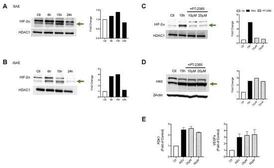 HIF-2α activation is also known to affect metabolic activities as well as modulate expression of proinflammatory factors. To better understand the contributions of HIF-2α during RSV infections, we first assessed whether HIF-2α was activated in SAE and iSAE cells at 6, 15, and 24 h p.i. We found a 1.4-fold increase in HIF-2α nuclear levels in SAE cells beginning at 15 h p.i. that decreased at 24 h p.i. as compared to the uninfected control (Figure 4A). A similar pattern was observed in iSAE cells, with a 3.7-fold increase at 6 h p.i. and return to levels comparable to the uninfected control by 24 h p.i. (Figure 4B). Next, we determined the effect of HIF-2α inhibition on HKII expression during RSV infections. iSAE cells were treated with PT-2385 (10 or 20 μM) for 1 h, followed by infection with RSV. Cells were then harvested at 15 h p.i. and nuclear extracts were subjected to Western blot analysis. HIF-2α activation was effectively decreased with either dose of PT-2385 (Figure 4C), however, there was no significant reduction in HKII expression in RSV infected PT-2385-treated cells, compared to untreated (Figure 4D). Inhibition of HIF-2α also failed to modulate the expression of PDK1 or VEGFa (Figure 4E). Collectively, these data demonstrate that RSV infection can activate HIF-2α, but this HIF protein does not modulate the glycolytic pathway or expression of other canonical HIF-1α gene targets in the course of RSV infection.
