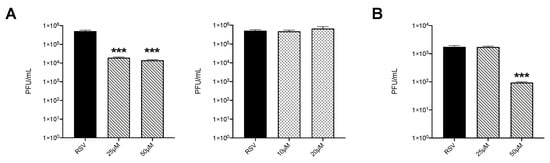 Effect of inhibition of HIF proteins on viral replication. (A) HEp-2 cells were infected with RSV at MOI of 0.1 in the presence or absence of PX-478 at 25 and 50 μM (left panel) or PT-2385 at 10 and 20 μM (right panel) and harvested at 36 h p.i. to determine viral titers by plaque assay. (B) iSAE cells were infected with RSV at MOI of 0.1 in the presence or absence of PX-478 at 25 and 50 μM and harvested at 36 h p.i. to determine viral titers by plaque assay. Viral titer analyses represent combined data from three independent experiments. Data are presented as mean ± SEM. Significant results as compared to the respective control are marked with asterisks, (*** p ≤ 0.001).